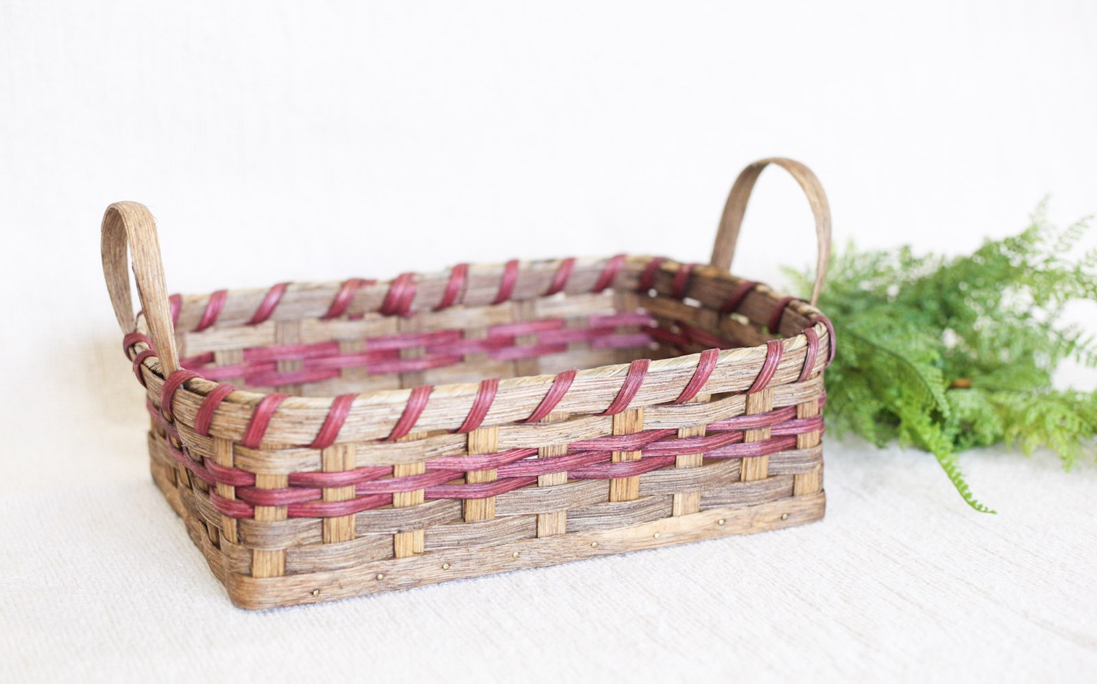 This handwoven basket is available with burgundy, navy or mixed accent reeds. Also available with no accent reed just stained in a walnut color.