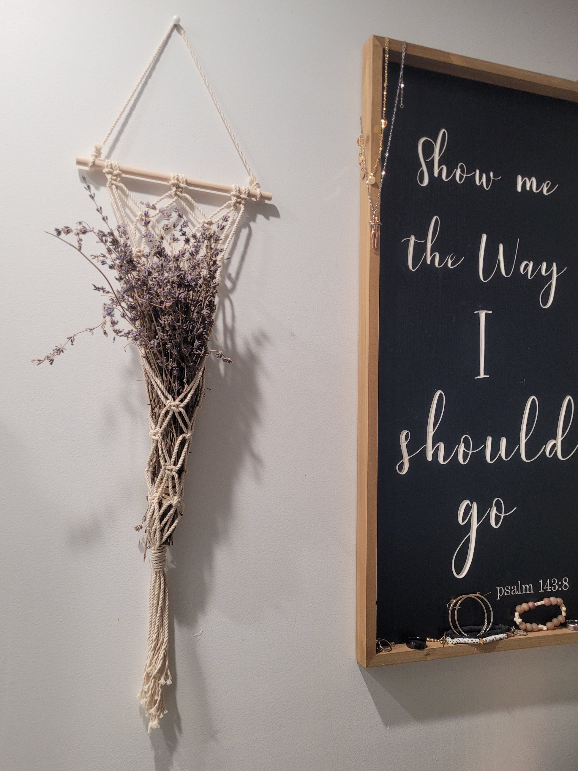 This Dried Flower Bouquet Holder/Wall Hanger is made with 3mm macrame cord in natural color and measures approximately 9" Wide x 30" Long.