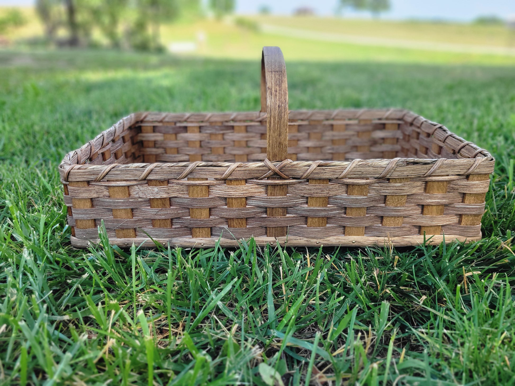 This handwoven basket is available with burgundy, navy or mixed accent reeds. Also available with no accent reed just stained in a walnut color.